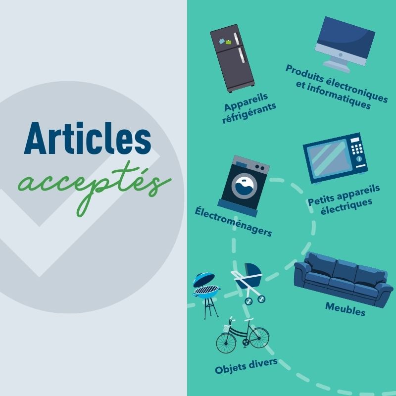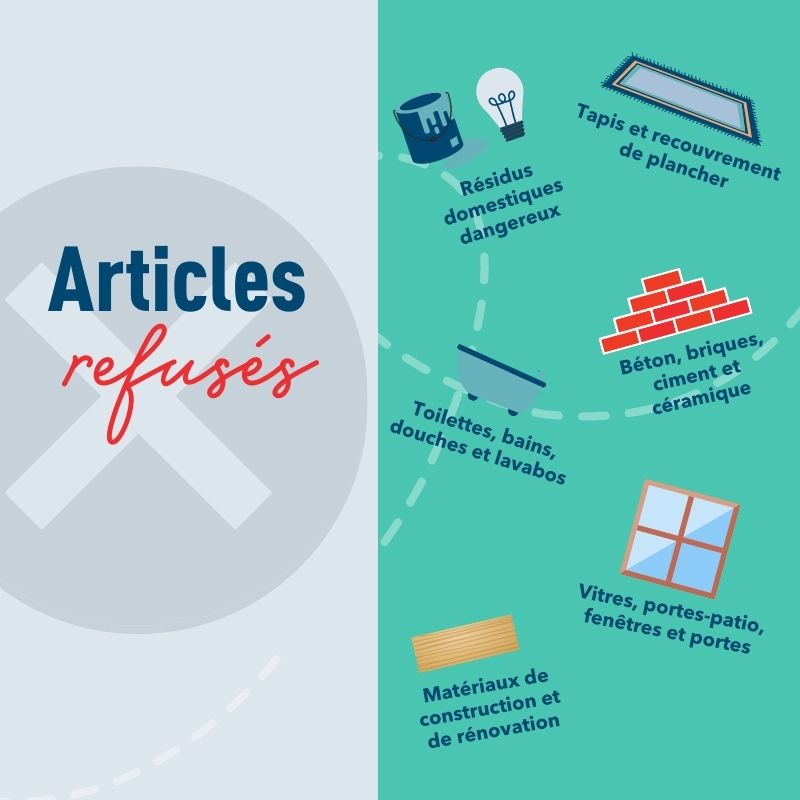 Vous trouverez la liste complète des matières acceptées et refusées ici : https://www.mrc-fjord.qc.ca/environnement/encombrants/