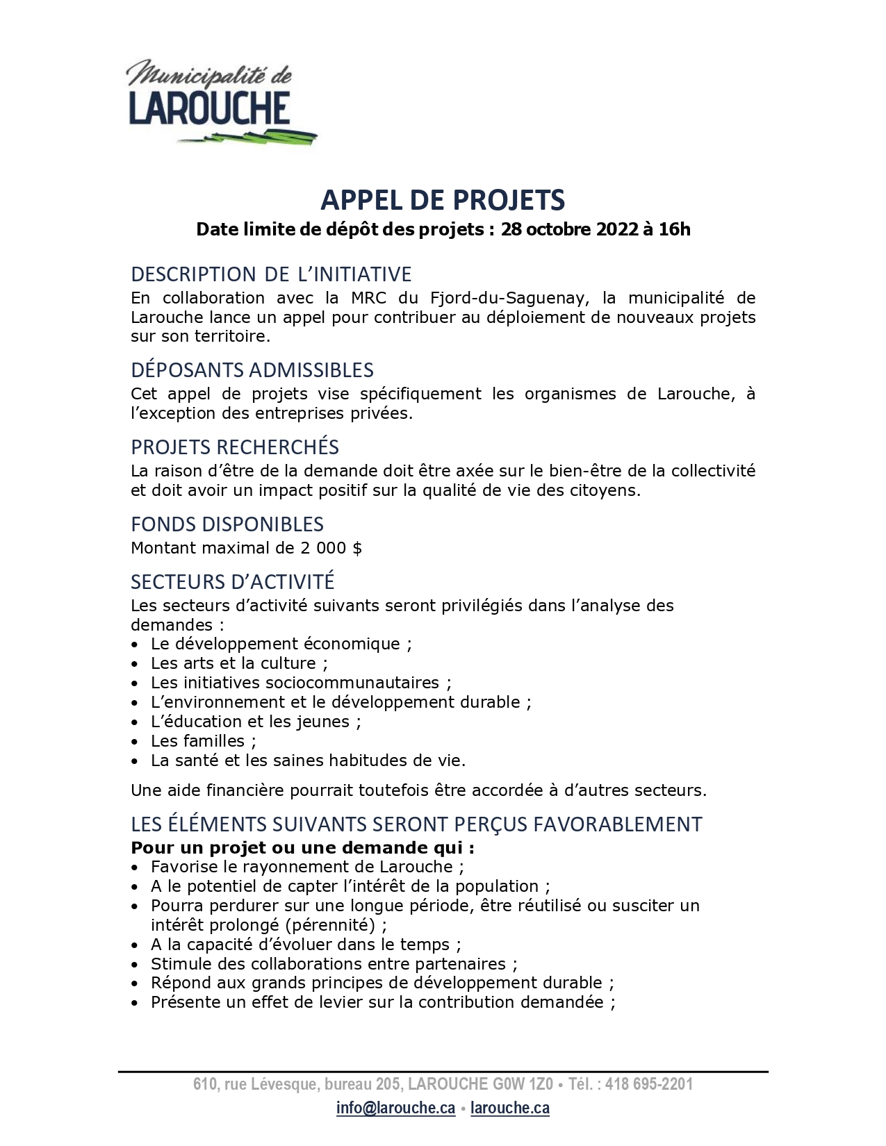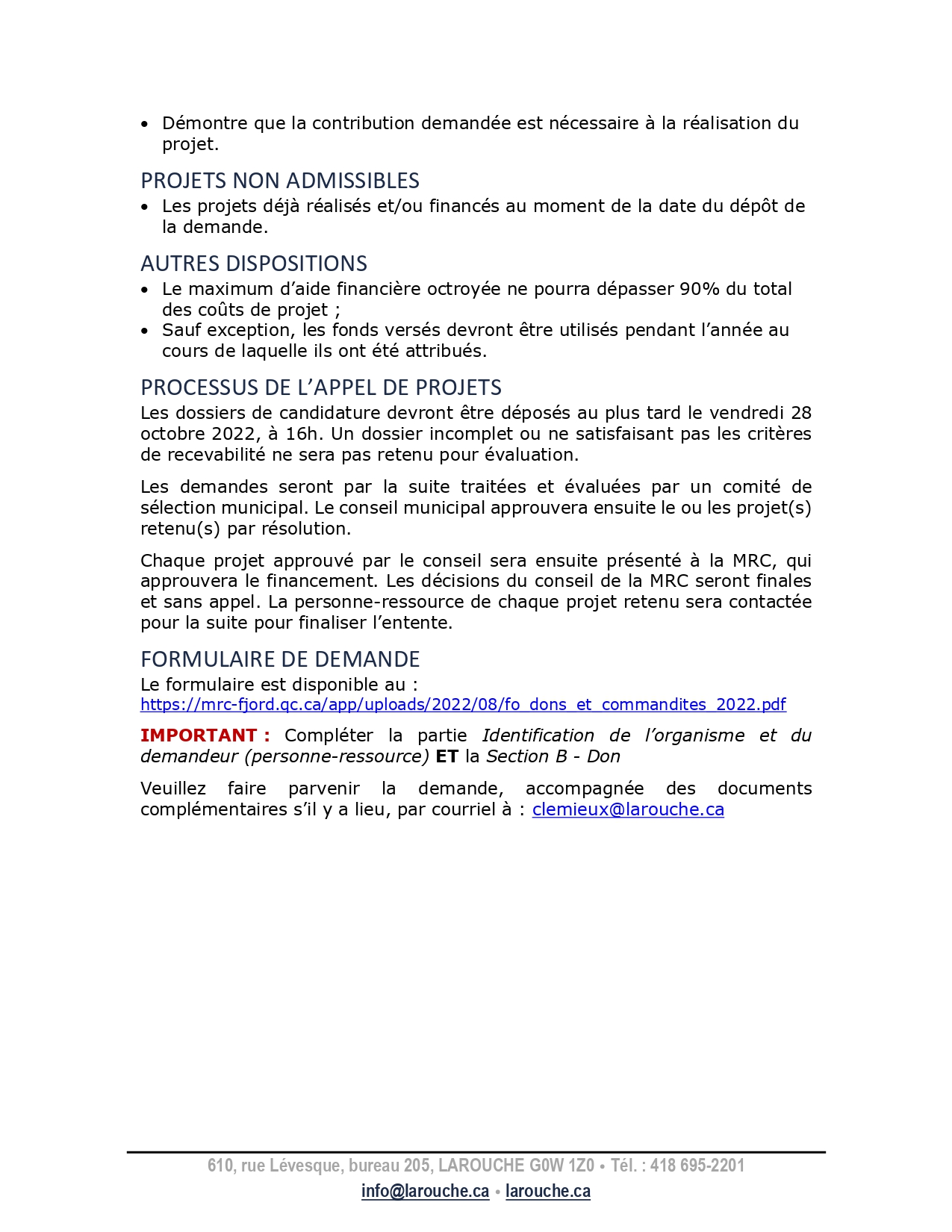 Appel de projet pour les organismes de Larouche